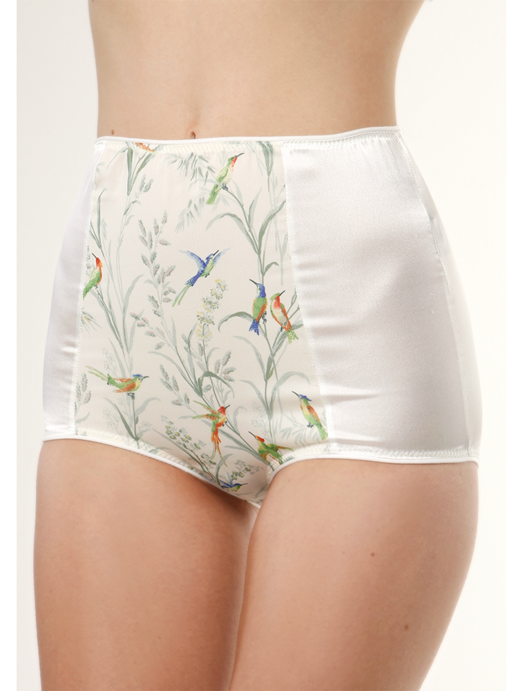 Paulina ist ein Slip mit hoher Taille und einem wunderschönen Vogelmuster Einsatz auf der Vorderseite.