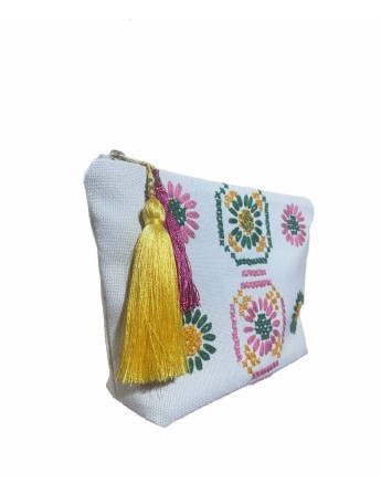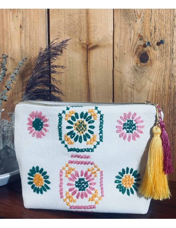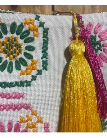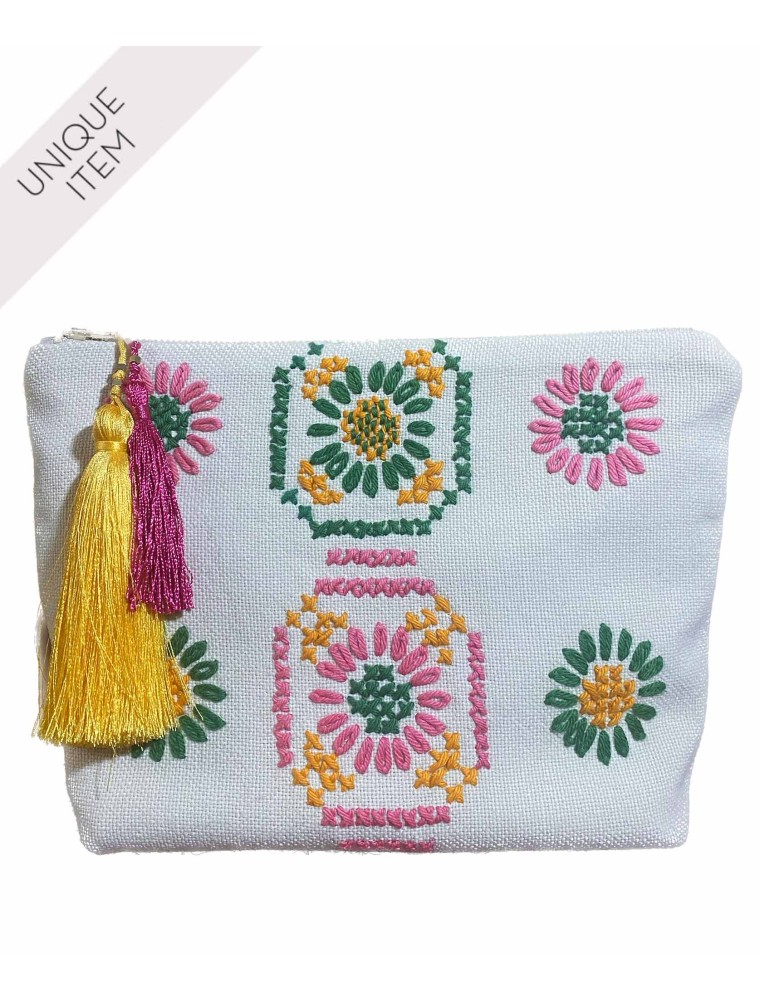 Diese kleine Kosmetiktasche ist upcycled aus einem alten handbestickten Tischläufer.