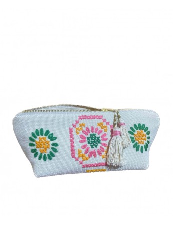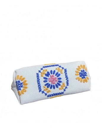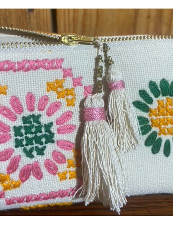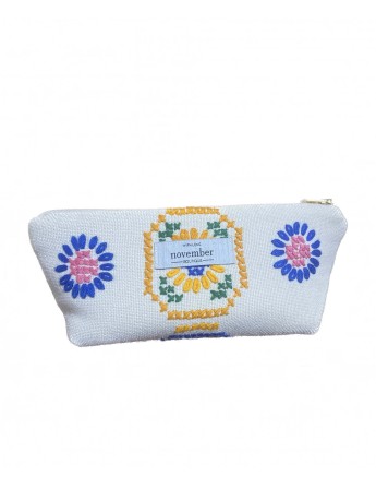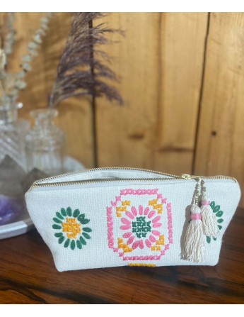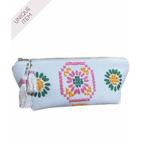 Diese kleine Kosmetiktasche ist upcycled aus einem alten handbestickten Tischläufer.