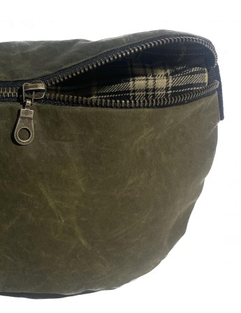 This bag was upcycled from an original old Barbour jacket. The waxed fabric is water repellent.