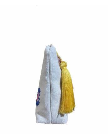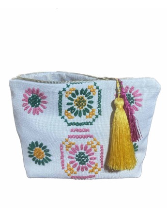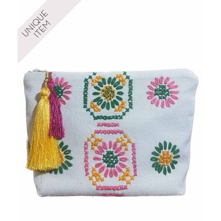 This small cosmetic bag is upcycled from an old hand-embroidered table runner.